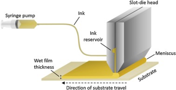 狹縫涂布法已廣泛應(yīng)用于連續(xù)大規(guī)模涂布制程,是非常適合卷對卷制程的涂布技術(shù)。狹縫涂布裝置包含兩個獨立的可移動刀片,兩刀片之間的間隙構(gòu)成一個狹縫,可供墨和進行流量控制(如圖4所示)。與刮刀涂層法相似,薄膜厚度可以透過調(diào)整前驅(qū)體溶液濃度、基板的性質(zhì)和刀片與基板之間的距離來控制,而油墨特性 (黏度和濃度)、抽墨噴涂速度、基材移動速度和刀片之間的狹縫尺寸也是薄膜性質(zhì)的可控件。因此,狹縫涂布法目前普遍被認為是最適合工業(yè)大規(guī)模生產(chǎn)的涂布技術(shù)。