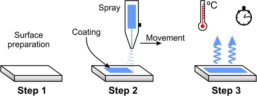噴涂法是一種以溶液形式的大規(guī)模涂布制程。為了提高噴涂過程中的再現(xiàn)性和穩(wěn)定性,通常會在噴涂系統(tǒng)中使用超聲波振動吸頭,以產(chǎn)生微小的墨滴,最后再透過氮氣槍直接沉積在基板上。在基板上,墨滴會融合成均勻連續(xù)的濕膜,接著在特定溫度下干燥獲得致密的薄膜(如圖5所示)。原則上,薄膜厚度可以透過改變前驅(qū)體溶液的流速、濃度、氮氣槍噴流的移動速度以及基板的溫度來調(diào)整。