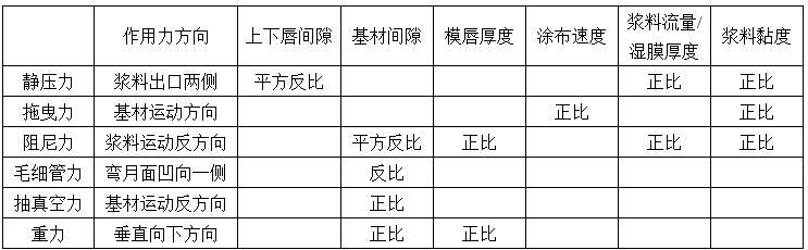 注:由于涂布過程中的各種力學(xué)現(xiàn)象交叉且格外復(fù)雜,表1中空白地方并不意味著就不存在相關(guān)關(guān)系,而是不存在直接相關(guān)關(guān)系或相關(guān)關(guān)系需要條件判斷并不明顯。