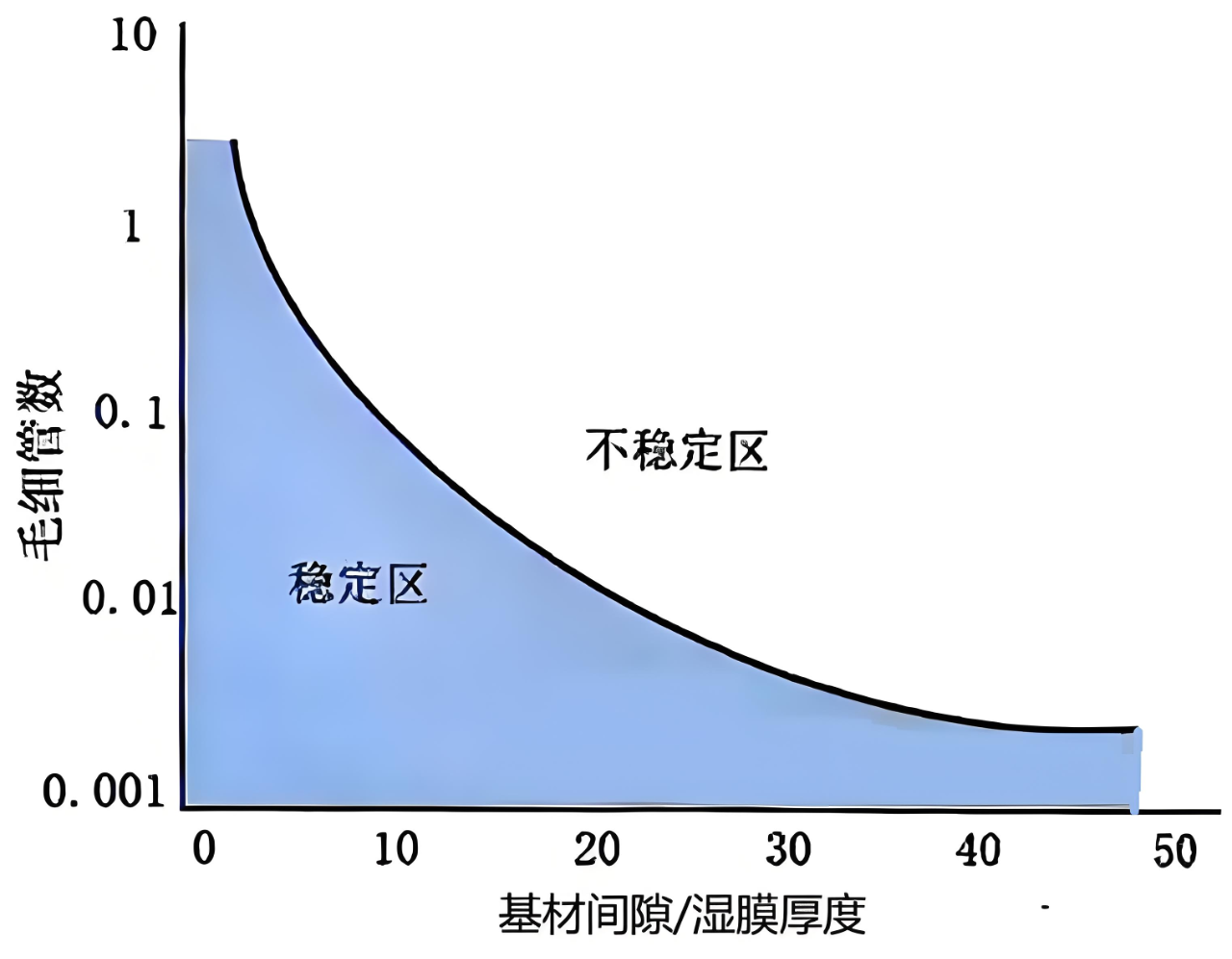 圖3所示的涂布操作窗口用“劉玉青涂珠六力模型”可以解釋為:濕膜厚度越大,所產(chǎn)生的泊肅葉“推力”越大,其超過庫埃特“拉力”作用時(shí)即會把涂珠“擠爆”,產(chǎn)生漿料滴落問題;而濕膜厚度越小,所產(chǎn)生的泊肅葉“推力”越小,庫埃特“拉力”作用相對于“推力”越大時(shí)即會把涂珠“拉斷”,產(chǎn)生氣泡夾帶問題。而較小的毛細(xì)管數(shù)(即較大的表面張力)可以拓寬“推力”與“拉力”不一致時(shí)的涂布操作窗口。
