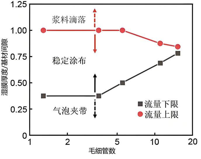 (1)式1中毛細(xì)管數(shù)的流體運(yùn)動速率,在涂布時(shí)可以用基材拖曳漿料的速度(涂布速度)來代表。除了毛細(xì)管數(shù),其他常用來表征操作窗口的無量綱數(shù)還包括基材間隙與濕膜厚度的比值等。