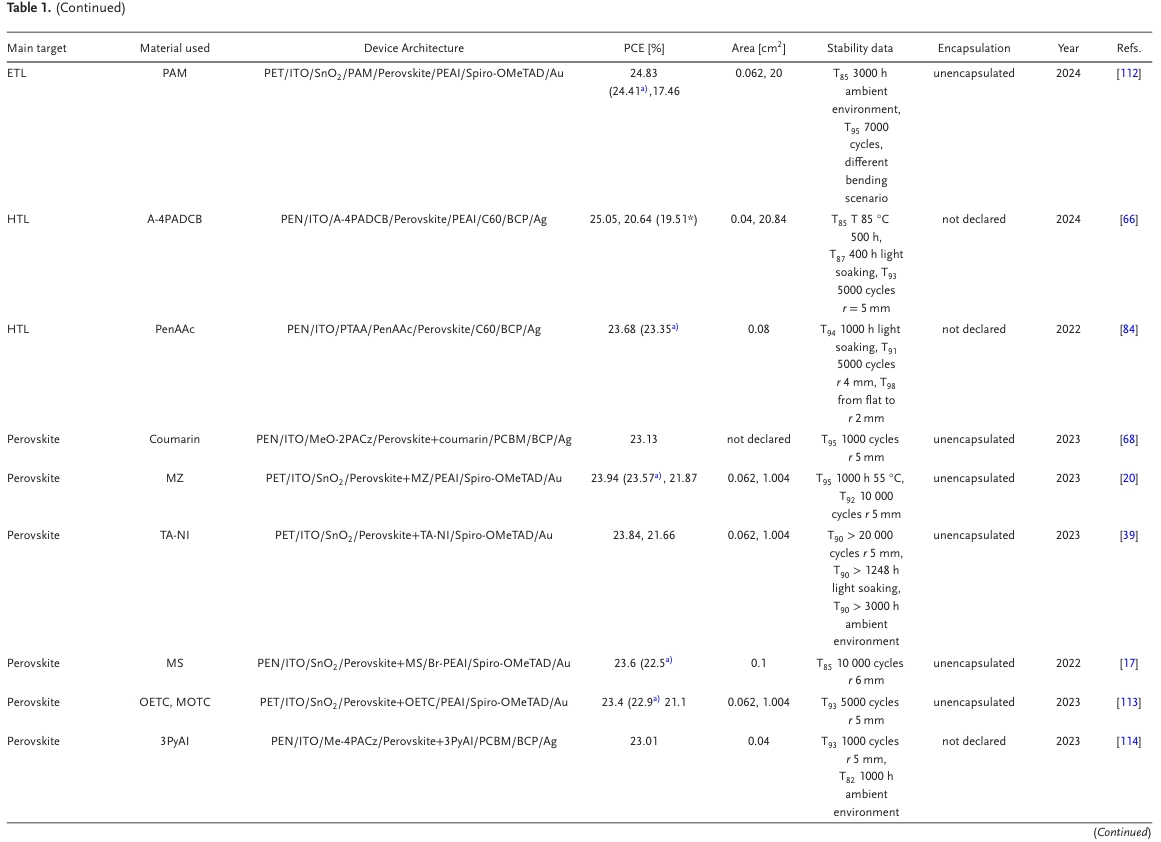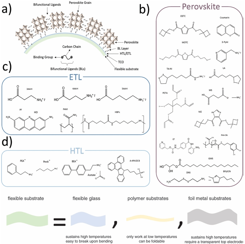 圖1. 在鈣鈦礦墨水中引入雙功能添加劑的機(jī)制,通過避免柔性鈣鈦礦太陽能技術(shù)彎曲和扭曲過程中活性層薄膜的分層和開裂問題,引入強(qiáng)結(jié)合基團(tuán)的短雙官能團(tuán)來改善晶界鈍化和界面增韌;針對(duì)ETL、HTL和鈣鈦礦層的柔性鈣鈦礦太陽能電池(f-PSCs)功率轉(zhuǎn)換效率(PCE)>23%的材料總結(jié)。