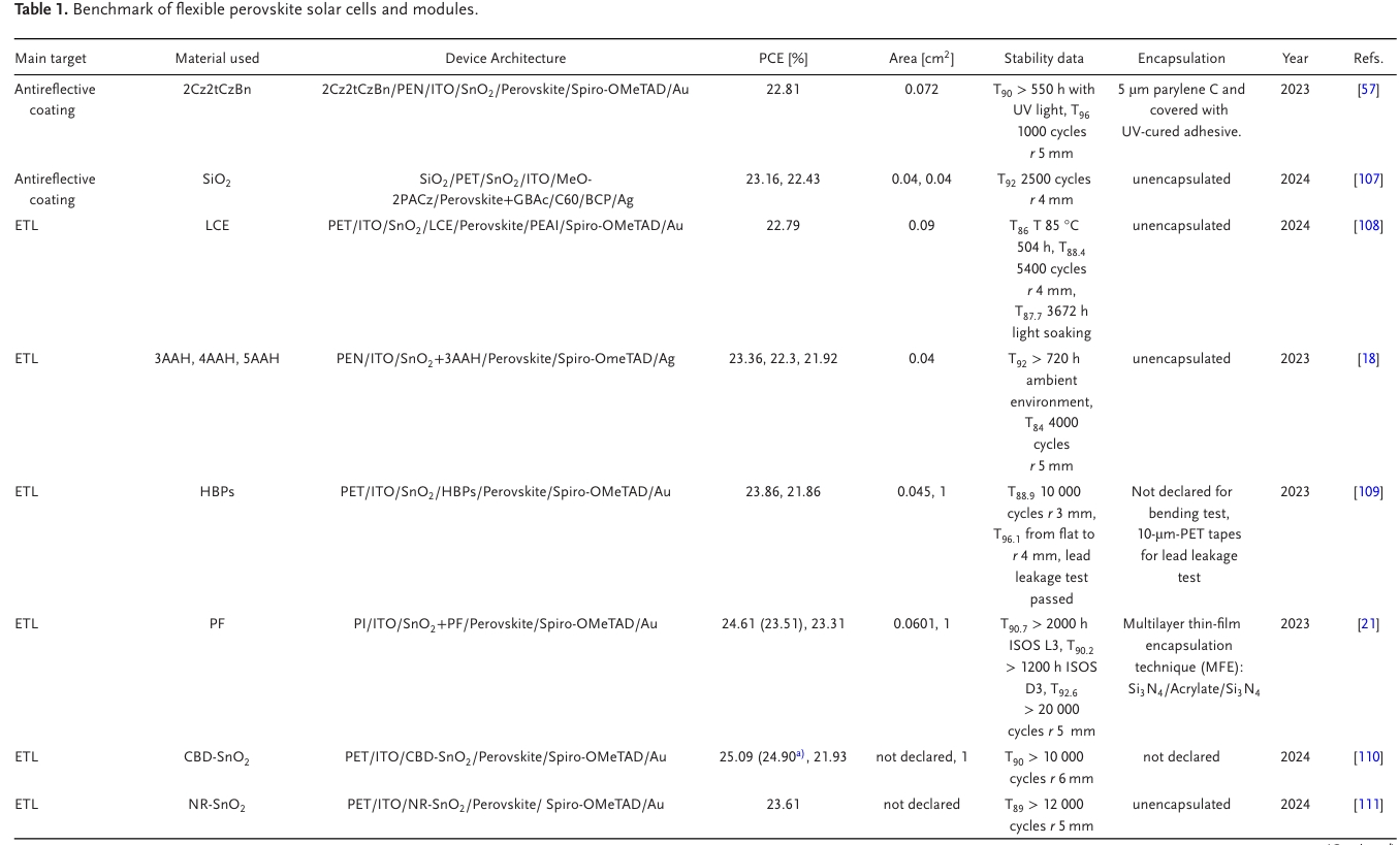 鈣鈦礦太陽能技術(shù)取得了令人矚目的進(jìn)展,在短短的14年里從3.8%提高到了26.1%的能量轉(zhuǎn)換效率。最初在帶有透明導(dǎo)電氧化物(TCOs)涂層玻璃的剛性襯底上測(cè)試,鈣鈦礦的吸引力在于使用低溫工藝(< 150 °C)簡(jiǎn)化制備步驟。這使得柔性襯底如聚對(duì)苯二甲酸乙二醇酯(PET)和聚萘二甲酸乙二醇酯(PEN)的使用成為可能,在易加工性和耐用性之間提供了一個(gè)折中,從而獲得具有高功重比的輕量型器件。