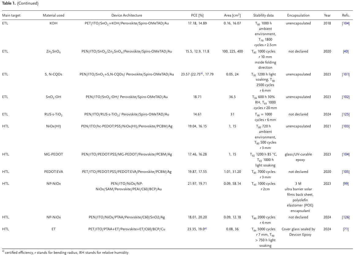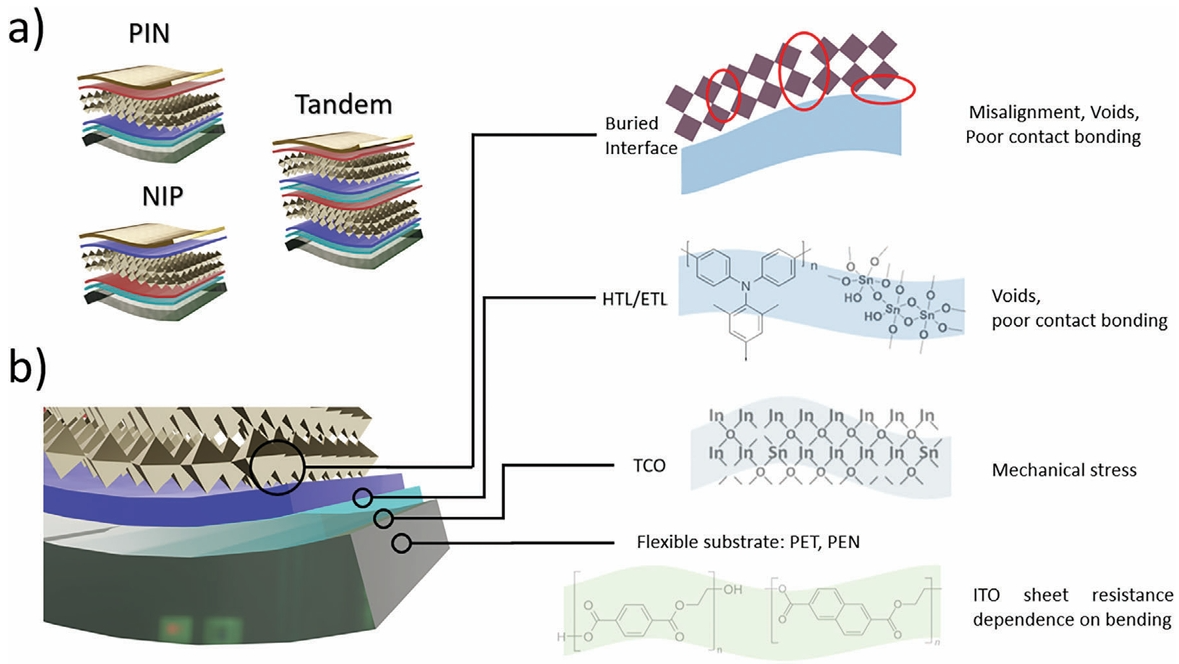 圖2. a) 用于柔性鈣鈦礦太陽能技術(shù)的器件結(jié)構(gòu):PIN,NIP和疊層器件結(jié)構(gòu)。b) 重點(diǎn)研究的主要問題是解決限制剛性和柔性襯底之間的差距:柔性襯底的選擇,柔性襯底和TCO之間的接觸,其中ITO的方塊電阻通過襯底彎曲來改變;TCO與HTL ETL之間的接觸,主要問題集中在孔洞的存在以及這些層之間的接觸結(jié)合較差;HTL/ETL與鈣鈦礦之間的接觸(埋底界面),鈣鈦礦層可能會(huì)錯(cuò)位,產(chǎn)生孔洞,并且在HTL / ETL下面的HTL / ETL中具有較差的接觸結(jié)合。