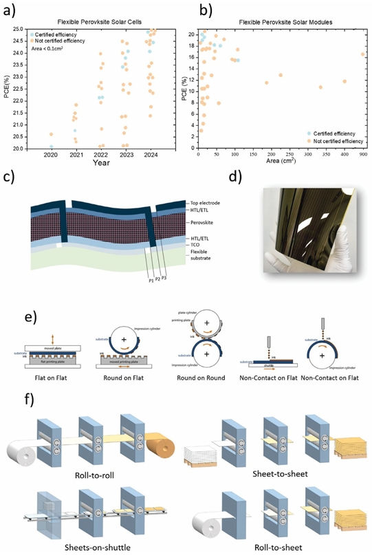 在這篇綜述中,作者更深入地探討了向柔性基底過渡時(shí)面臨的具體挑戰(zhàn),包括在各種環(huán)境條件下出現(xiàn)的機(jī)械和化學(xué)穩(wěn)定性問題,強(qiáng)調(diào)了對(duì)商業(yè)可行性至關(guān)重要的升級(jí)過程。作者重點(diǎn)關(guān)注電池的串聯(lián)以減輕電阻率的影響,以及對(duì)柔性襯底的激光刻蝕技術(shù)(P1、P2、P3)的優(yōu)化,這是在更大尺度上保持性能的一個(gè)重要方面。