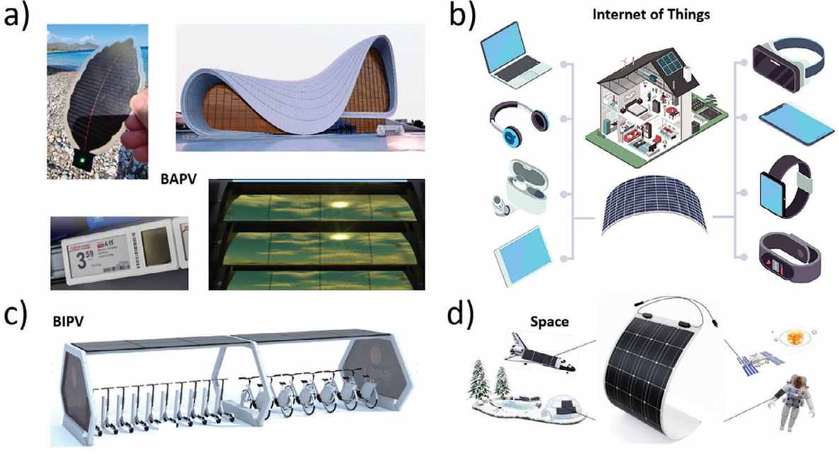 圖6. 柔性鈣鈦礦太陽能技術(shù)的商業(yè)應(yīng)用:a) 建筑應(yīng)用光伏應(yīng)用(BAPV),具有自由的形態(tài)設(shè)計(jì),可適應(yīng)任何建筑,市場(chǎng)上有2種產(chǎn)品可供使用,如基于鈣鈦礦的電子貨架標(biāo)簽(PESL)和遮光板。源:Saule Technologies b) 物聯(lián)網(wǎng)應(yīng)用,具有潛在的使用基于鈣鈦礦的柔性光伏作為替代品或?yàn)殡姵丶夹g(shù)供電的便攜式設(shè)備存在于住宅和個(gè)人使用中,如智能手機(jī),智能手表和智能帶,便攜式筆記本電腦,無線耳機(jī)和虛擬現(xiàn)實(shí)googles。源:IDTechEx研究;c) 建筑集成光伏(BIPV),通過在建筑中集成柔性太陽能產(chǎn)品和特定的裝置,從窗戶和立面收集能量,為電動(dòng)車、代步車和共享單車供電,例如一個(gè)汽車港口站;資料來源:Saule Technologies;d) 適用于空間和極地環(huán)境的柔性太陽能技術(shù),因?yàn)槠渚哂凶畹偷墓β手亓勘群洼^好的低溫性能。