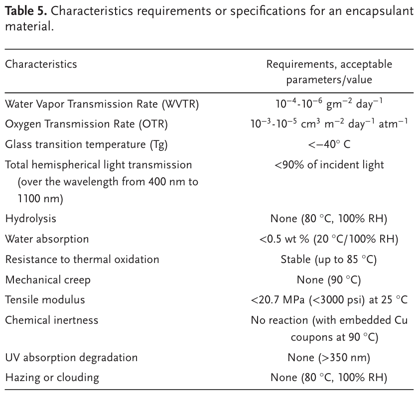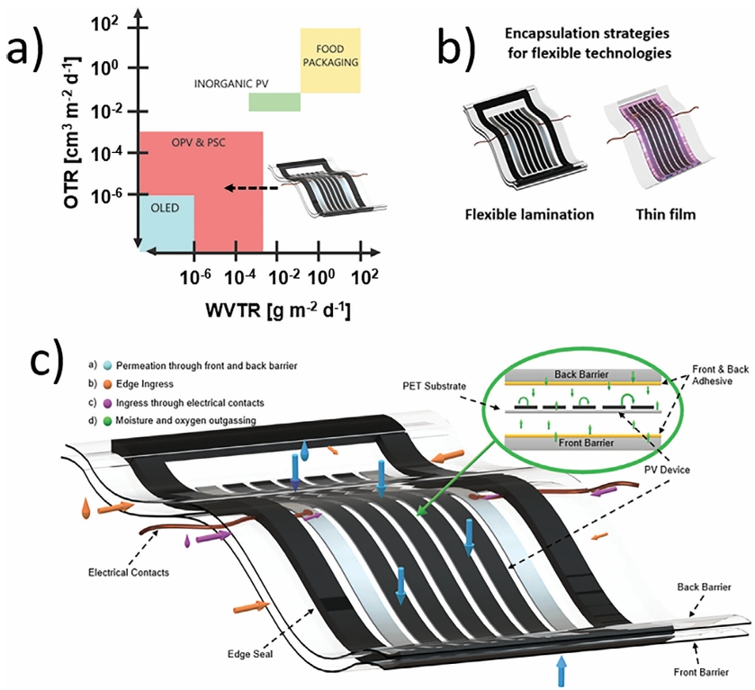 7. 封裝作者認(rèn)為封裝是保證太陽能電池壽命、效率和安全性的關(guān)鍵步驟,特別是隨著對(duì)柔性襯底太陽能電池的關(guān)注越來越多。柔性模組需要封裝材料在保持柔韌性的同時(shí),對(duì)水分、氧氣和機(jī)械應(yīng)力提供堅(jiān)固的保護(hù)。相比之下,剛性模組使用封裝材料,如乙烯-醋酸乙烯酯(EVA),它提供了優(yōu)異的保護(hù),但缺乏靈活性。對(duì)于柔性模組,薄膜封裝、柔性層壓等先進(jìn)的封裝方法必不可少。柔性鈣鈦礦模塊的封裝通常使用柔性聚合物(例如,聚烯烴、聚氨酯等)和多層阻擋層薄膜等材料。這些材料必須提供低的水蒸氣透過率(WVTR)和氧氣透過率(OTR)來保護(hù)敏感的鈣鈦礦層。例如,聚烯烴等柔性封裝材料可以提供低至0.01 g / m2/day的WVTR值,這對(duì)于保持器件性能和穩(wěn)定性至關(guān)重要。在柔性PSC生產(chǎn)中常見的卷對(duì)卷工藝,需要在很長(zhǎng)的長(zhǎng)度上均勻地沉積封裝層,以實(shí)現(xiàn)一致的保護(hù)。高性能的阻隔膜對(duì)長(zhǎng)期穩(wěn)定性至關(guān)重要,水蒸氣和氧氣透過率(WVTRs和OTRs)是關(guān)鍵指標(biāo)。鈣鈦礦太陽能技術(shù)要求WVTR或OTR的阻隔性能反映了這些器件對(duì)水分和氧氣(表5 ,圖5a)的敏感性。實(shí)現(xiàn)如此嚴(yán)苛的阻隔性能對(duì)阻隔薄膜的初始制備和批量生產(chǎn)都提出了挑戰(zhàn)。表5. 封裝材料的特性要求或規(guī)范。