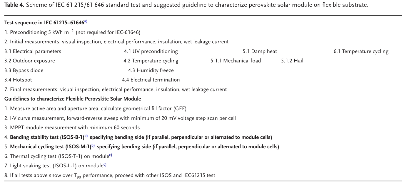 表4. IEC 61 215 / 61 646標(biāo)準(zhǔn)測(cè)試的方案和建議的指南,以表征柔性襯底上的鈣鈦礦太陽能組件