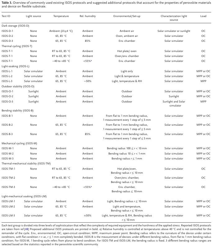表3. 概述了常用的現(xiàn)有ISOS協(xié)議,并提出了考慮柔性襯底上鈣鈦礦材料和器件性能的附加協(xié)議