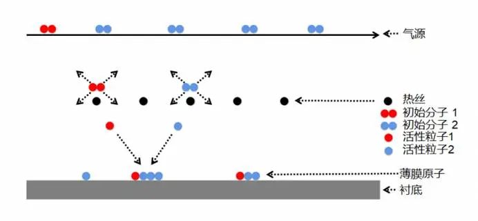 原理:通過(guò)高溫金屬絲(如鎢、鉭)熱解反應(yīng)氣體(如甲烷、硅烷),生成活性基團(tuán),沉積于基材表面形成薄膜。